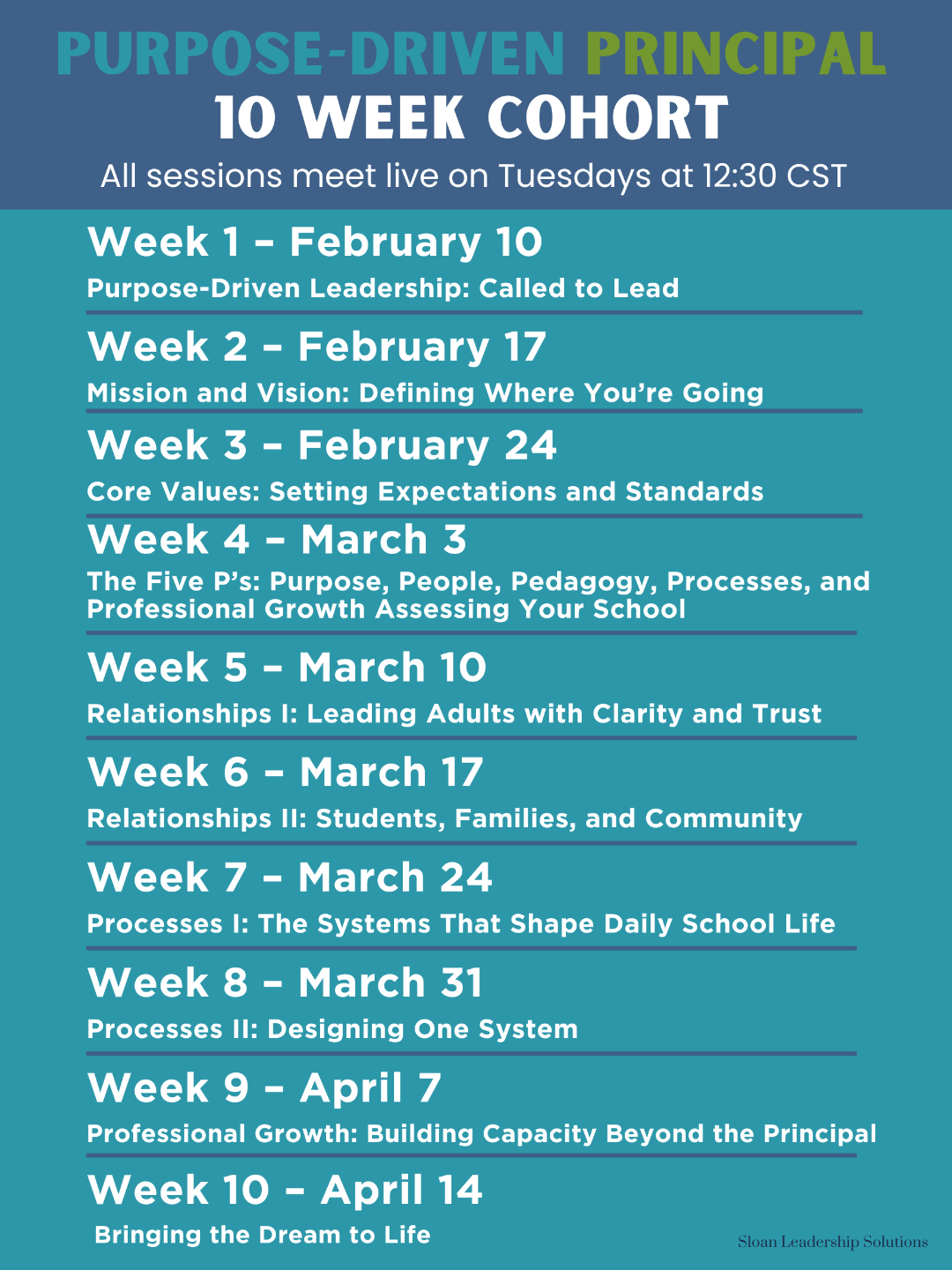 Strong schools don’t happen by accident. The Purpose-Driven Principal Cohort is a 10-week journey that helps principals align purpose, people, and systems so that leadership feels focused rather than chaotic.